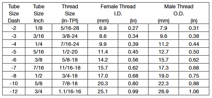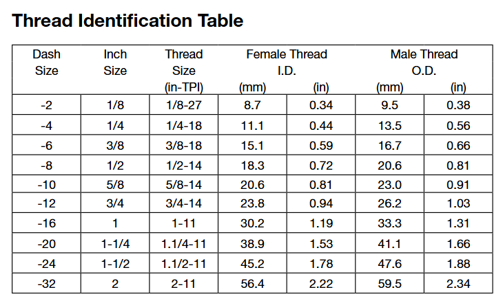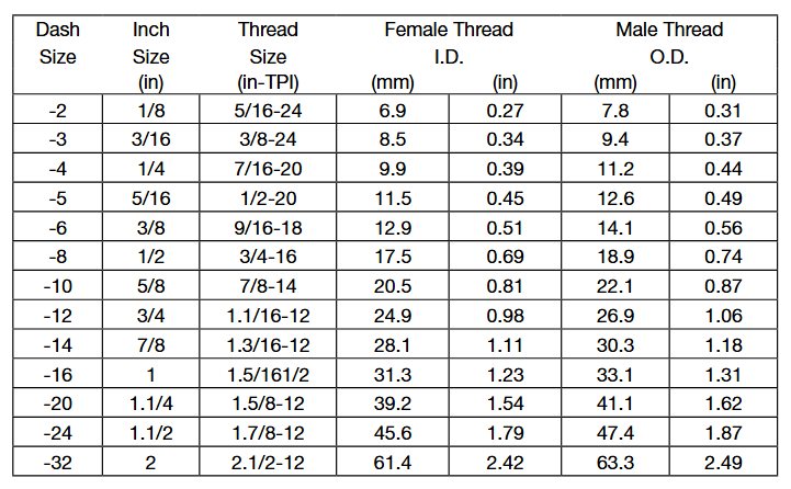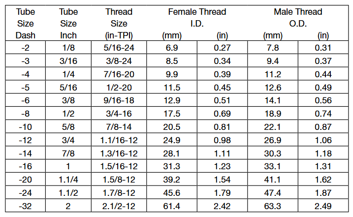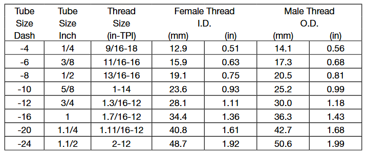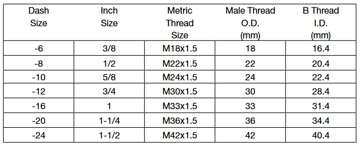 注意:在-02、-03、-04、-05、-08和-10尺寸,SAE45°擴(kuò)口的螺紋同SAE 37°擴(kuò)口的螺紋相同。但是密封面角度不同。請仔細(xì)測量密封角度以區(qū)分。