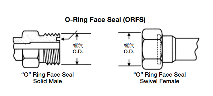 外螺紋接頭上有直螺紋和加工出的平面。內(nèi)螺紋接頭上也有直螺紋和加工出的平面。通過擠壓平面間的O型圈來實(shí)現(xiàn)密封,類似于對開法蘭接頭。螺紋實(shí)現(xiàn)機(jī)械連接。