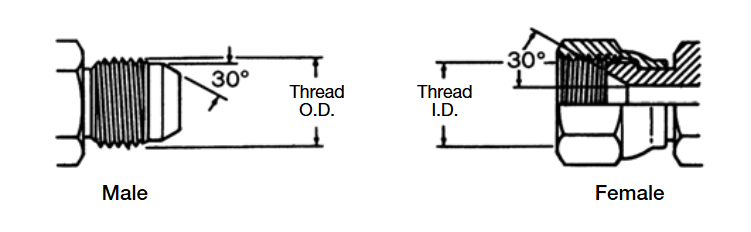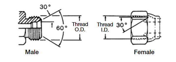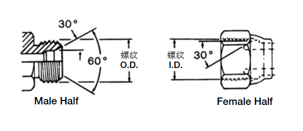 日標(biāo)30°擴(kuò)口外螺紋接頭僅與日標(biāo)30°擴(kuò)口內(nèi)螺紋接頭相配。外螺紋接頭和內(nèi)螺紋接頭都有螺紋和30°錐面。密封是通過30°錐面來實(shí)現(xiàn)的。日標(biāo)30°擴(kuò)口接頭符合JISB0202標(biāo)準(zhǔn),與英制BSPP螺紋一樣。英制接頭和日標(biāo)接頭也都有30°錐面,但是他們不能互換使用,因?yàn)橛⒅棋F面是相反的。