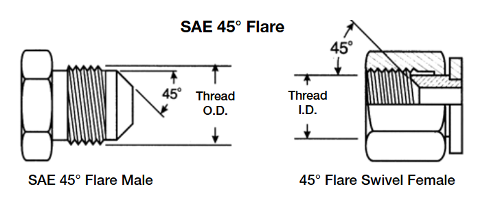 這項(xiàng)通常適用于有45°擴(kuò)口或錐面的接頭。此密封型式通常用于軟銅管,因?yàn)檐涖~管比較容易擴(kuò)成45°角。這通常用于低壓應(yīng)用,如電冰箱、汽車、卡車管件系統(tǒng)等。SAE 45°外錐僅于SAE 45°內(nèi)錐匹配。