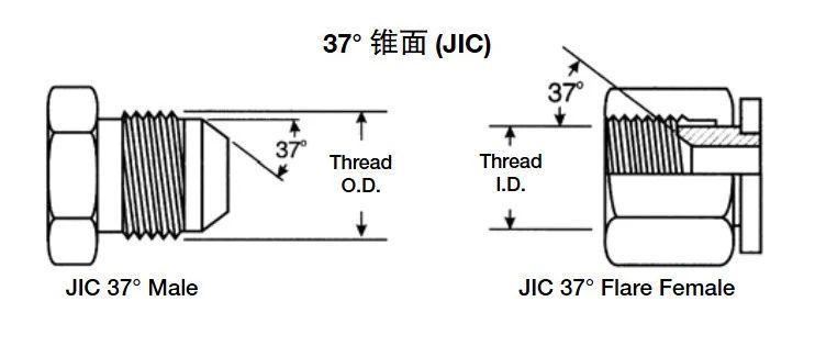 美國汽車工程師協(xié)會(huì)(SAE)確定37°擴(kuò)口或錐面用于高壓液壓管的密封。這種設(shè)計(jì)通常稱為JC接頭。JIC 37°外錐僅與37°內(nèi)錐匹配。JIC外螺紋為直螺紋并有37°錐面。JIC內(nèi)螺紋為直螺紋并有37°錐面。密封由37°內(nèi)、外錐面之間形成的線密封來完成。螺紋實(shí)現(xiàn)機(jī)械連結(jié)。