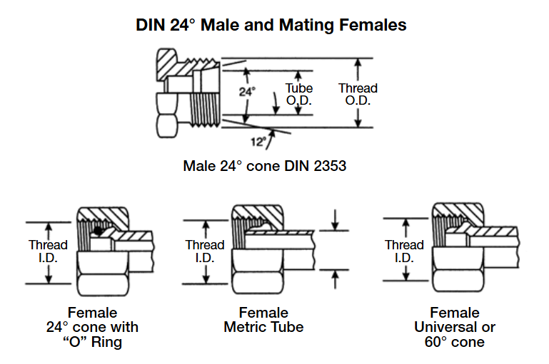 DIN 24°錐外螺紋接頭可與以下三種內(nèi)螺紋接頭相配。外螺紋接頭有24”錐面,直管公制螺紋和與鋼管外徑相匹配的臺(tái)階孔。與之相匹配的內(nèi)螺紋接頭可以是24°外錐帶O形圈,(DKO型式)的公制管接頭或者通用的24°錐或60°錐。