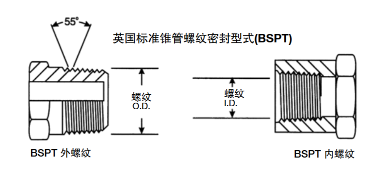 BSPT接頭類似于NPTF,但是不可以互換。兩者之間的大多數(shù)尺寸的螺紋螺距不同,BSPT螺紋的牙型角為55°,而NPTF螺紋的牙型角為60°。