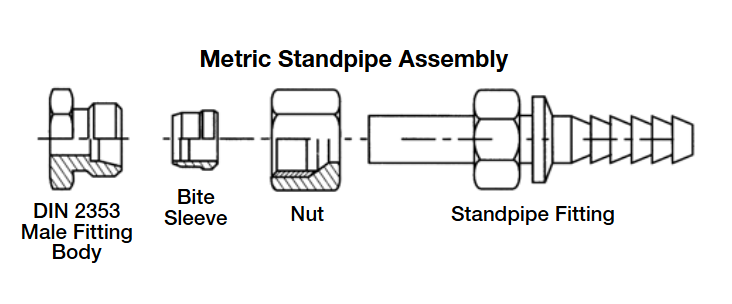 一個(gè)公制直管接頭由三個(gè)附件和外螺紋接頭體組成。三個(gè)附件為鋼管,卡套和卡套螺母。三者裝配關(guān)系如下圖所示。DIN輕系列裝配,使用DIN輕系列公制螺母。DIN重系列裝配,使用DIN重系列公制螺母。根據(jù)鋼管外徑選擇卡套和鋼管。