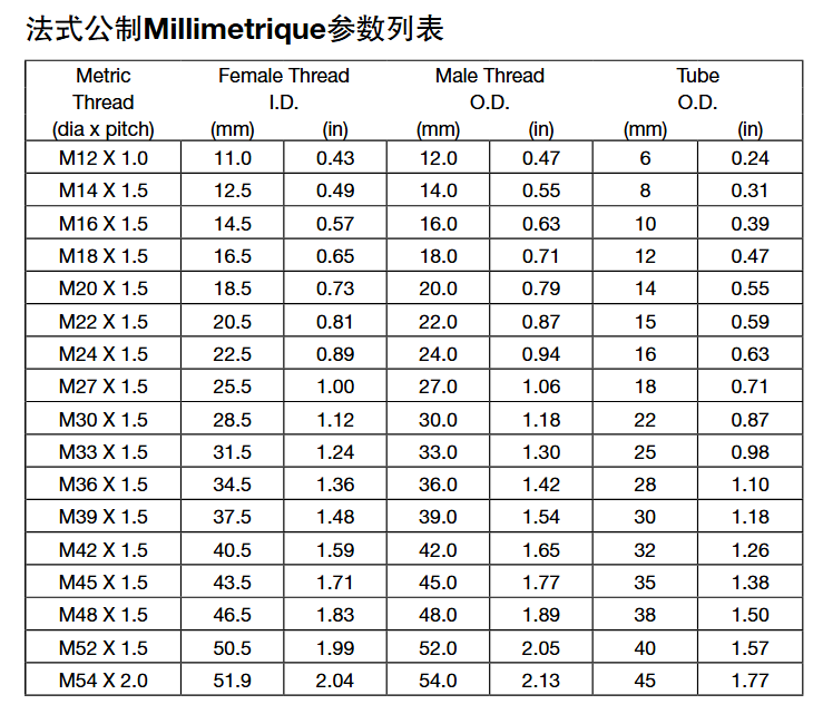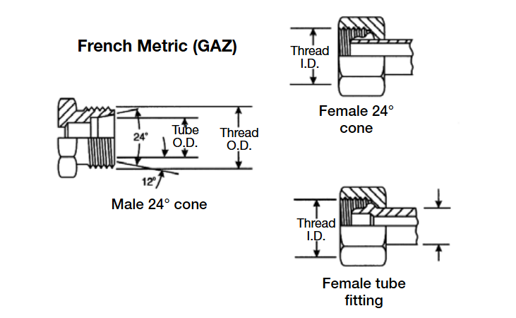 法式接頭包括普通的外螺紋接頭和2種不同的內(nèi)螺紋接頭,法式公制(GAZ)外螺紋接頭可以匹配24°錐內(nèi)螺紋接頭和管內(nèi)螺紋接頭。外螺紋接頭有24°內(nèi)錐面和直管公制螺紋。內(nèi)螺紋接頭有24度外錐面或管套和直管公制螺紋。Millimetrique系列可用于所有管徑的公制管,GAZ系列只可用少數(shù)管徑的公制管。