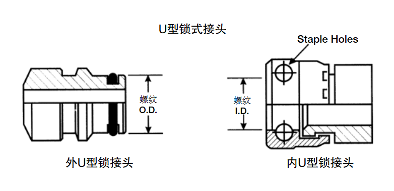 用一個(gè)U型狀的針或U形卡通過兩孔插入,穿過外接頭的凹槽以將連接鎖定。密封是由外接頭的O形圈和內(nèi)接頭的光滑面接觸來實(shí)現(xiàn)的。