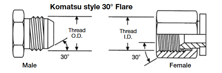 小松式30°擴(kuò)口平行螺紋接頭和日制30°擴(kuò)口平行螺紋接頭相同的,除了螺紋不一樣。小松接頭遵從JIS B 0207標(biāo)準(zhǔn),使用公制細(xì)牙螺紋。小松接頭的密封通過30°擴(kuò)口實(shí)現(xiàn)。