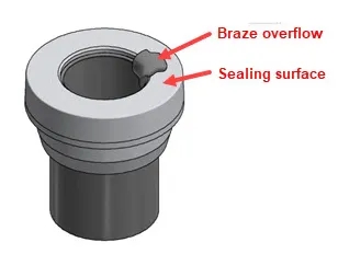 釬焊是一項復雜的操作,可能會導致密封面上出現(xiàn)焊渣溢流。由于密封面被破壞,就可能造成鋼管螺母處的泄漏。焊條熔化時產(chǎn)生的熱量使密封面位置可能產(chǎn)生焊渣溢流,焊條融化液會流向更高溫度的地方。一旦發(fā)生融化液溢流,應立即轉(zhuǎn)移到襯套的小直徑端進行焊接,使融化液均勻流過接頭。如果發(fā)現(xiàn)釬焊溢流,裝配前請取下受影響的襯套,然后在該位置處重新釬焊一個新的襯套。