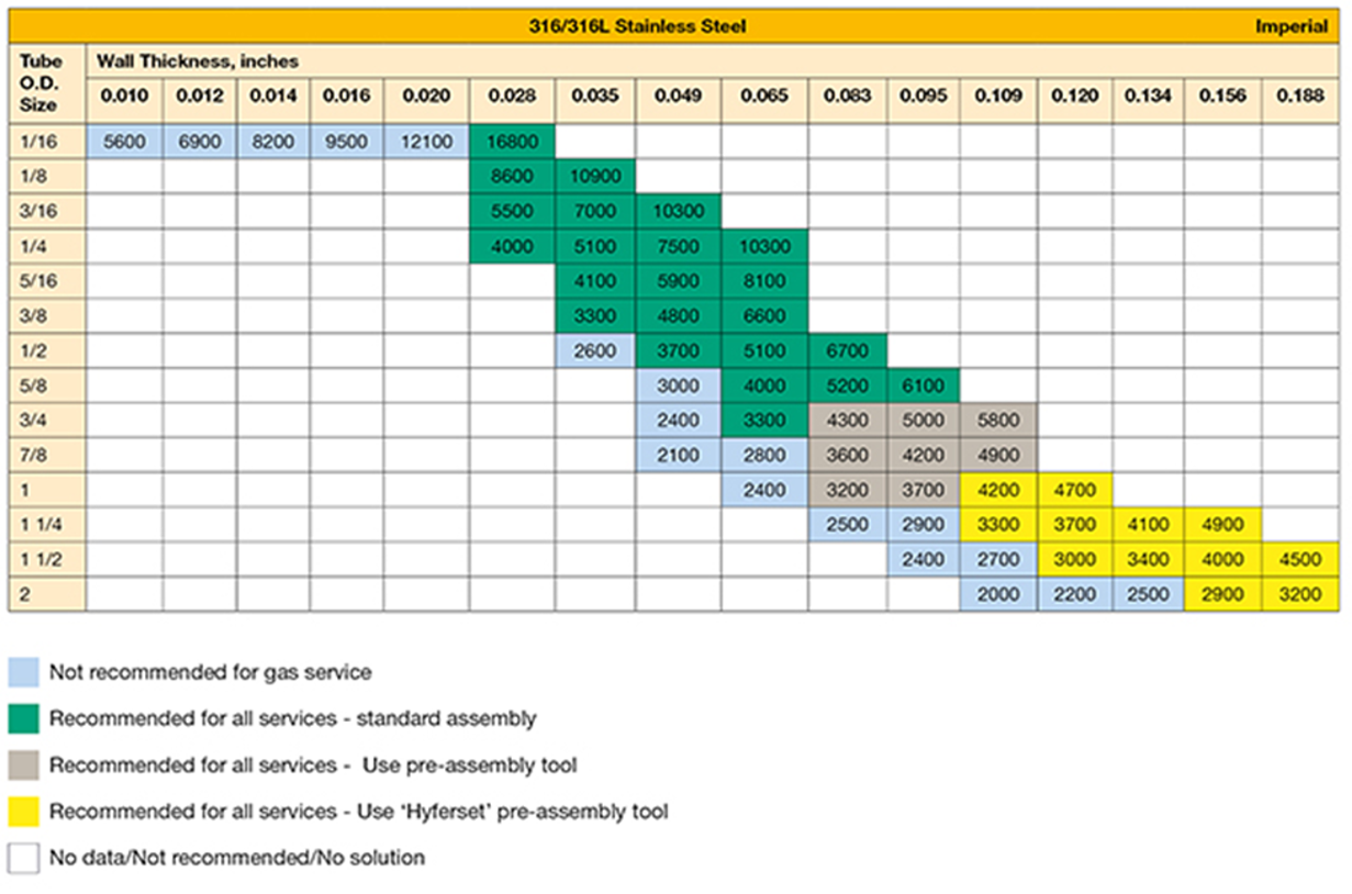 只有當(dāng)儀表管提供徑向阻抗且管材硬度較套圈硬度小時(shí),才能實(shí)現(xiàn)穿透。厚壁儀表管有助于提供阻力,下表提供了一系 列壁厚選項(xiàng),以便安全使用派克管件。藍(lán)色等級表示直徑和壁厚的組合,此組合不適用于氣體服務(wù)。