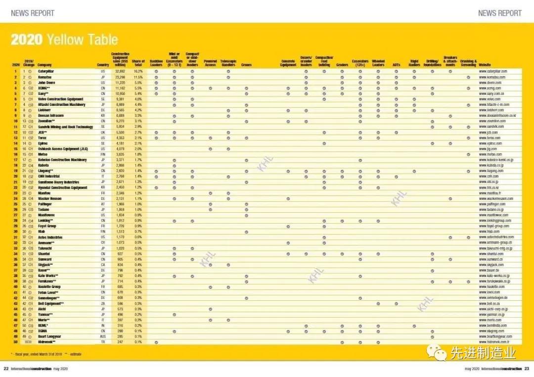 世界領先的工程機械信息提供商英國KHL集團旗下《國際建設》雜志(International Construction) 5月發(fā)布了2020年度全球工程機械制造商50強排行榜 (Yellow Table 2020)。