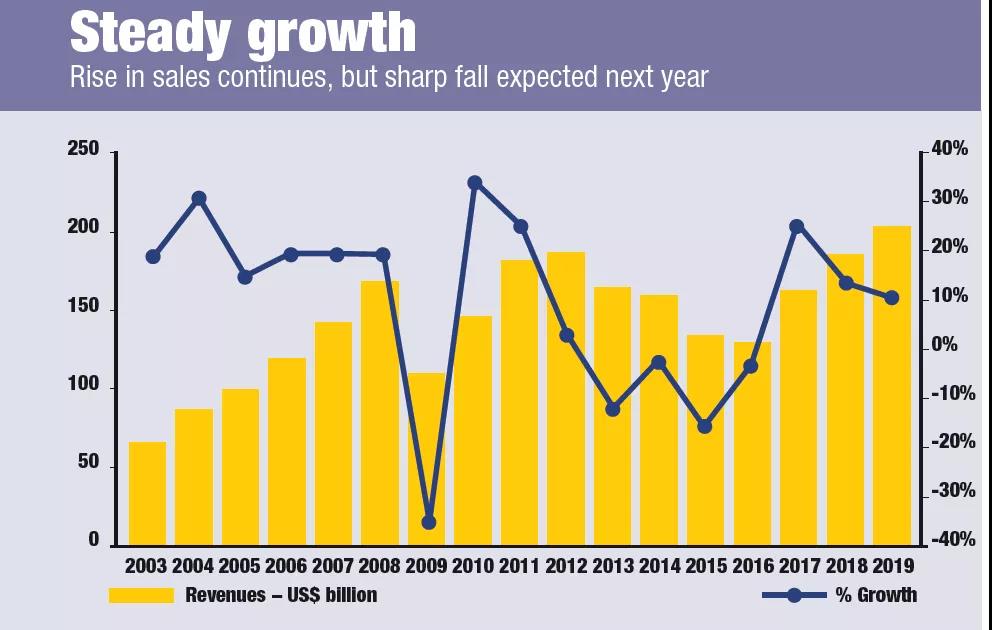 盡管2019年的數(shù)字創(chuàng)歷史新高,但值得強調的是,增速正在放緩?!禮ellow Table》顯示2017年與2016年相比增長了25.5%,2018年的增長率為13.5%。受新冠肺炎疫情影響,明年全球銷量將大幅下降。