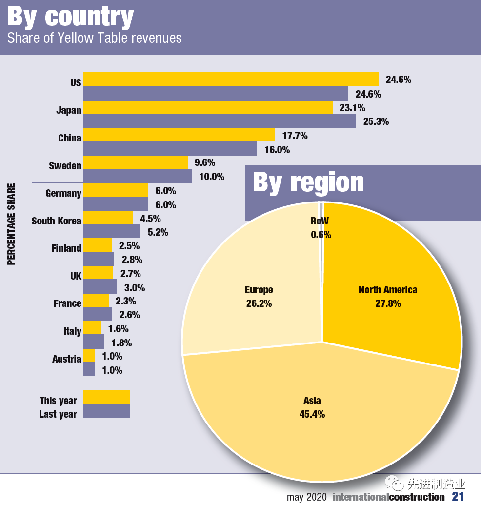 最新的《Yellow Table》顯示,2019年全球建筑設備銷售額達到創(chuàng)紀錄的2027億美元,也是首次超過2000億美元,與2018年相比,這個數(shù)字增長了10%,前50大制造商2018年的設備銷售總額為1840億美元。