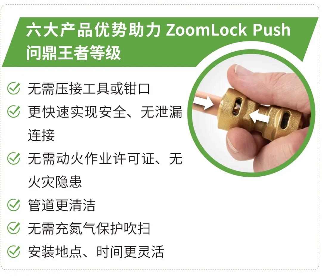 如果空調制冷管路連接技術也有段位的話,那么ZoomLock Push推入/按壓式接頭一定是王者等級!它不僅延續(xù)原ZoomLock產品的尊貴血統(tǒng),堅守安全、清潔的無泄漏連接品質,更另辟蹊徑,進一步加速管道安裝。