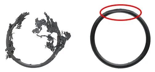 從外觀來看,O形圈的損壞有多種形式,請觀察一下O形圈是否有異乎尋常的地方。比如是否有缺失?是否有磨損? 0形圈是否被擠壓和/或變形?這些問題很細微,需要仔細觀察。圖3顯示了O形圈明顯損壞和不明顯損壞兩種情況。