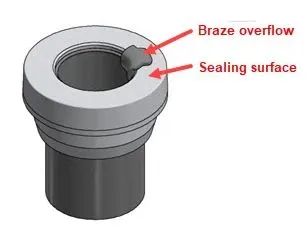 釬焊是一項復雜的操作,可能會導致密封面上出現(xiàn)焊渣溢流。由于密封面被破壞,就可能造成鋼管螺母處的泄漏。焊條熔化時產生的熱量使密封面位置可能產生焊渣溢流,焊條融化液會流向更高溫度的地方。一旦發(fā)生融化液溢流,應立即轉移到襯套的小直徑端進行焊接,使融化液均勻流過接頭。如果發(fā)現(xiàn)釬焊溢流,裝配前請取下受影響的襯套,然后在該位置處重新釬焊一個新的襯套。