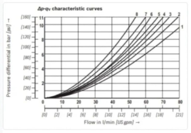 所有閥門都有不同的流動通道和流體方向變化,這將在特定流量下產(chǎn)生一定的壓降。這些壓降因不同的閥芯類型而異,這對于控制能源效率并確保負載有足夠的可用壓力非常重要。