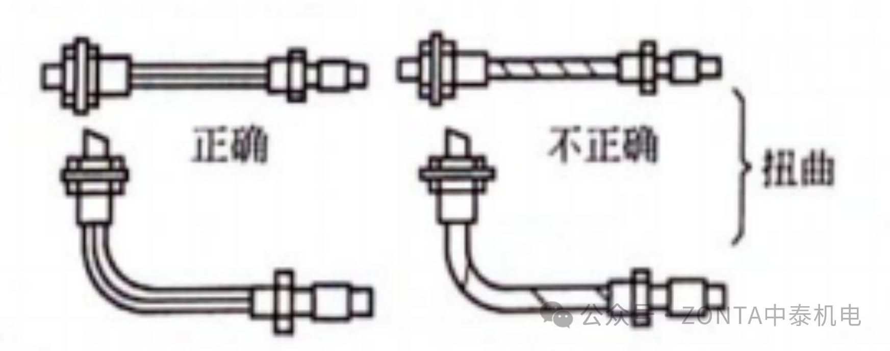 6、在直角拐彎處最好不用軟管,否則在壓力交變的工況下,會因軟管彎曲處的長度和曲率半徑的變化而疲勞導(dǎo)致破裂,產(chǎn)生漏油,使用不銹鋼軟管時更應(yīng)注意。