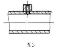圖3所示為液壓缸缸筒,缸筒上的螺紋孔常安排在焊接工序之后加工,這樣就不可避免地要在螺紋孔出口與缸筒內(nèi)壁的交界處產(chǎn)生毛刺。為清除毛刺,必須設計制作專用刀具對其進行加工,達到光滑過渡的目的。圖4為專用刀具的結(jié)構。使用時,先將刀桿從螺紋孔中插人,然后從側(cè)面將刀頭安裝在刀桿上,旋轉(zhuǎn)刀桿即可將毛刺除掉并加工出光滑完整的表面。