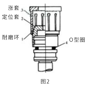 圖2所示工裝由定位套和漲套組成。定位套頭部有5°倒角,用于引導O形圈和耐磨環(huán)裝入活塞端部溝槽。漲套由彈性較好的65 Mn鋼經(jīng)熱處理制成,加工成均勻?qū)ΨQ的8瓣結(jié)構。需要注意的是,加工各瓣底部的小孔時,分度要均勻,銑開各瓣時應使鋸口對準小孔的中心,以保證漲套各瓣能均勻漲開。同時各部位都應進行(光滑)倒角,以免損壞密封圈。