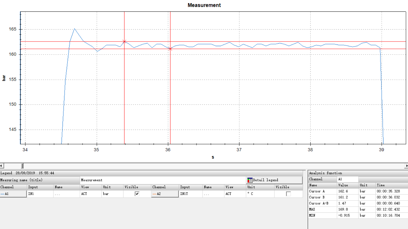 伺服驅(qū)動(dòng)葉片泵系統(tǒng),配合壓力傳感器和電機(jī)編碼器對(duì)系統(tǒng)壓力和電機(jī)轉(zhuǎn)速采集,運(yùn)用PID 算法,完成對(duì)系統(tǒng)的壓力和流量的雙閉合控 制。閉環(huán)控制使得開(kāi)、合模、射膠位置、保壓位置、射退位置得以精確控制,使得保壓壓力實(shí)現(xiàn)穩(wěn)定控制。以下是T7DS E38(120.6cc)在162bar下的保壓測(cè)量值,從該圖表中可以看 出,系統(tǒng)過(guò)沖壓力為3bar左右,穩(wěn)定后壓力在 161.2-162.6bar之間,壓力波動(dòng)在+0.6~0.8bar。