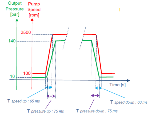 紅色曲線是速度閉環(huán)控制響應(yīng)曲線,綠色曲線為壓力閉環(huán)控制響應(yīng)曲線。為了防止氣穴現(xiàn)場(chǎng)發(fā)生,應(yīng)避免壓力上升和下降梯度超過(guò)極限 值,建議壓力上升梯度極限≤2500bar/s,下降 梯度極限≤3000bar/s。